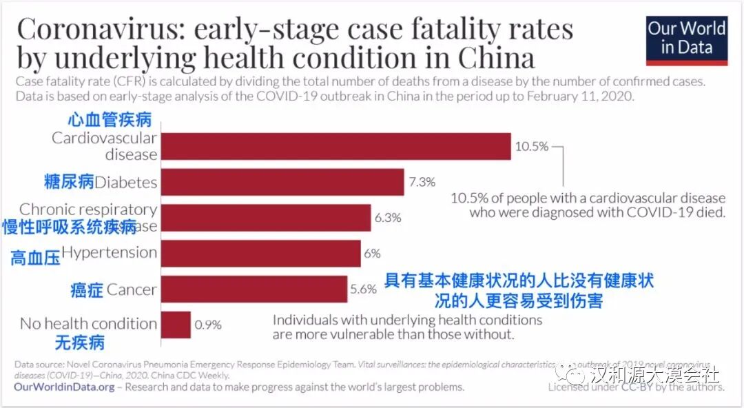 每个人都有不同的风险感知,但高于0.5%的病死率已经算是非常危险了。上图可以看到小于40岁的风险在0.2%,到了40-50岁风险就翻到了接近1%,60-70岁的风险直升3.6-8%,而80岁以上风险最高为14.8%。年龄是一方面,下图我们再来看看还有什么身体状况会提高风险。